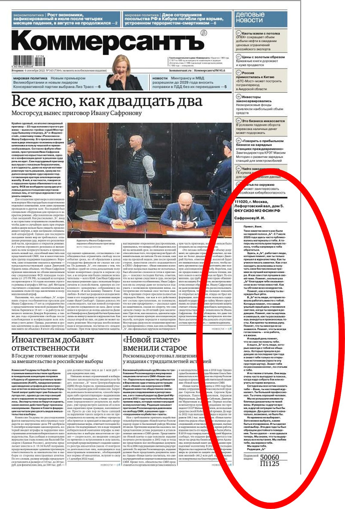 A major Russian newspaper publishes a frontpage editorial, a strong letter of support to its former reporter Ivan Safronov who was sentenced to 22 years on trumped-up charges yesterday. Putin and his thugs took over the country, but people try to resist wherever they can.