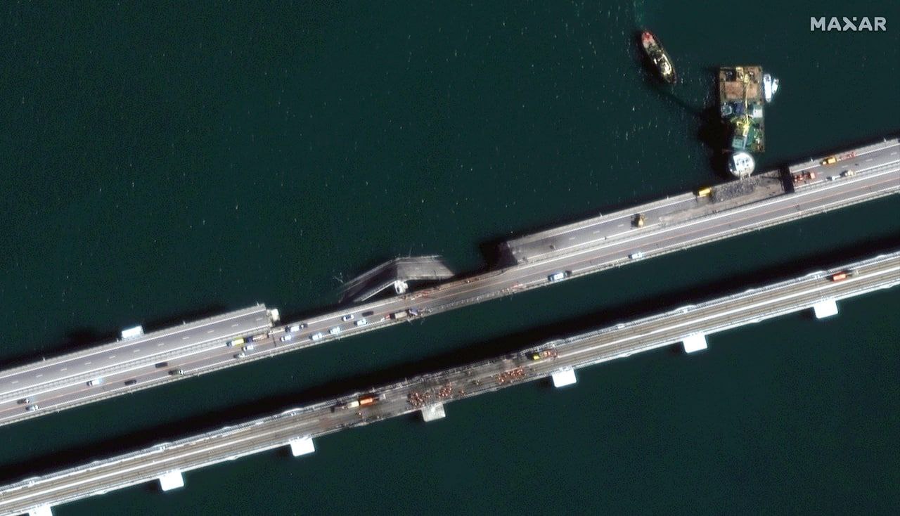 This is the satellite image of the #CrimeanBridge provided by @Maxar. The railway is still not functioning. Considering that the 🇷🇺logistics rely heavily on railways, the 🇷🇺forces in occupied regions of southern #Ukraine are cut off from the key resupply route right now.